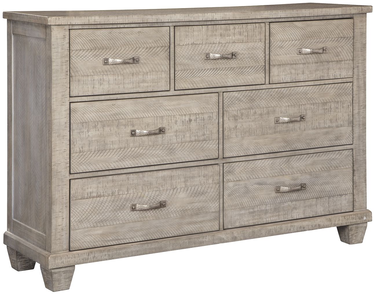 Balancing chic flair with a relaxed sensibility, this dresser strikes just the right tone for rustic sophistication. Beautifully clean lines are subtly enhanced with relaxed distressing and understated saw marks for authentic barn wood character. Hammered-effect hardware is the perfect finishing touch.
