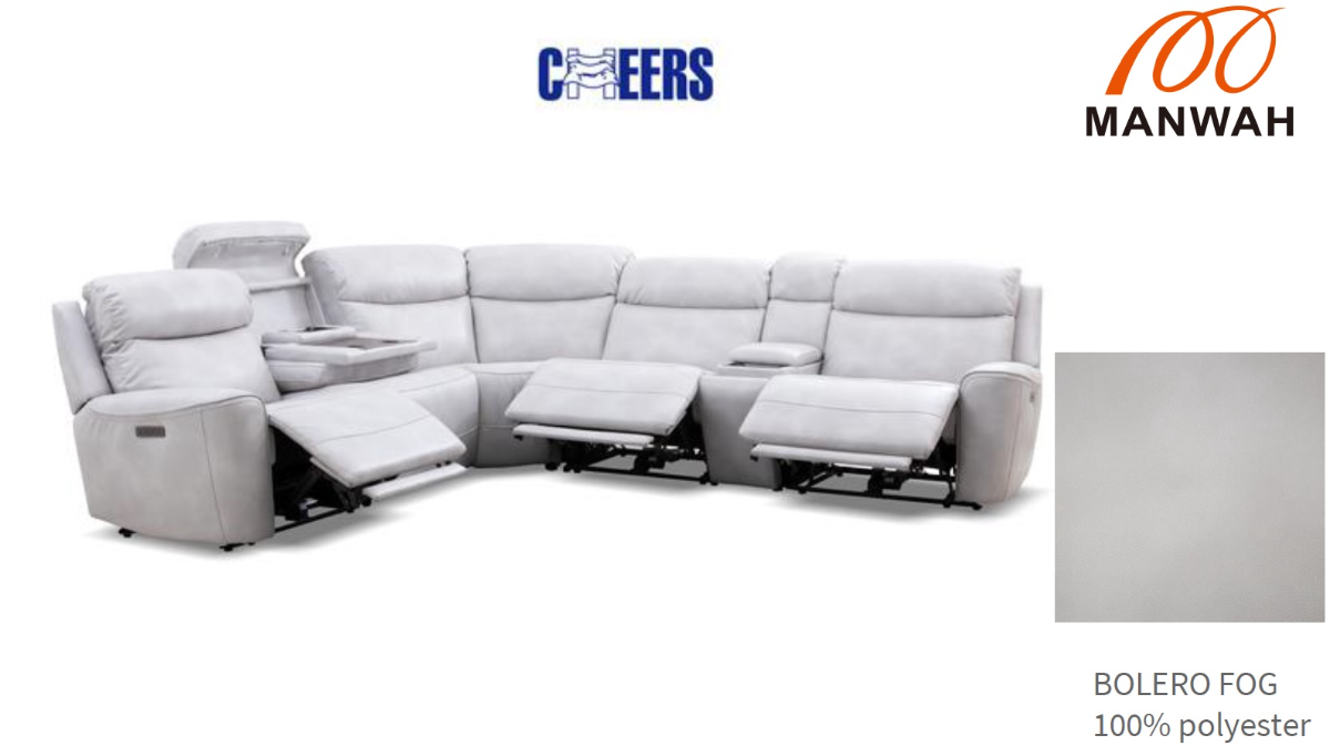 If you’ve got a penchant for simple yet elegant contemporary beauty, this reclining sectional has your name written all over it. This Bolero Fog 6-Piece Power Reclining Sectional features two power reclining chairs with power headrest zero gravity, an armless power recliner zero gravity, an armless chair with a drop down table, wireless and USB charger and cupholders. It also has a console with storage, wireless and USB charger and cupholders. Cover: Bolero Fog 257041, 12% Polyurethane, 88% Polyester.Read More