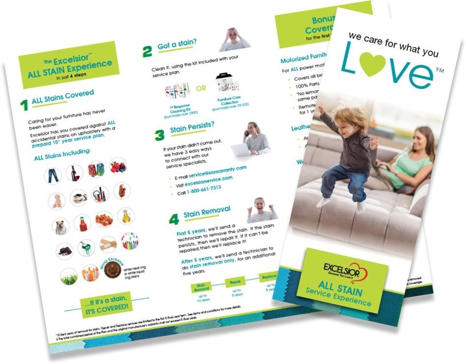 Caring for your furniture has never been easier. The Excelsior ALL Stain Experience is a prepaid 10 year service plan that has you covered against ALL accidental stains on upholstery and includes a specially formulated care kit for in-home care and maintenance of the upholstery on your furniture.Read More