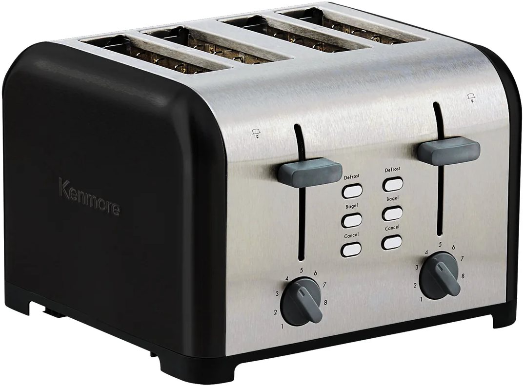 Speed up your morning routine with this elegant 4-slice toaster. Toast or defrost your way to a delicious healthy breakfast with this 4-slice stainless steel toaster from Kenmore. From English muffins to Texas toast, this 1400W toaster accommodates everything with its extra-wide slots and self-adjusting bread guides, and the numbered dial offers 9 shade settings so you have plenty of options to suit your family's individual taste.Read More