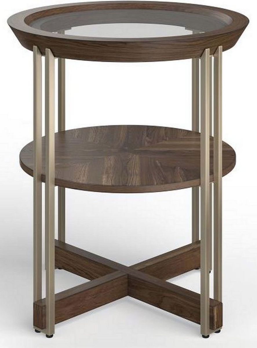Each table features a wood-framed, clear glass top that creates a window to its stunning wood base and elegant metal legs. A warm Walnut finish highlights the rich grain patterns showcased by its hickory veneers and is paired with Tarnished Silver metal legs. Place these stunning tables anywhere you need a bit of undeniably chic character.