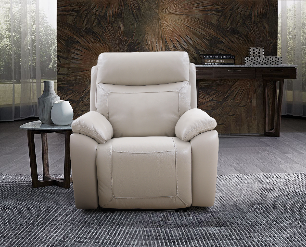 Beautiful Leather Recliner featured in stone color leather, pillow arms and contrast stitching. Leather on seat, arms and back.Read More