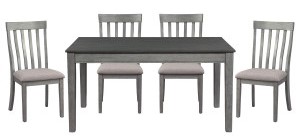 The ends of the table feature drawers for quick and easy storage of your smaller table top accessories. Gray finish is a versatile option for your decorative preferences. Wood framed chairs feature vertical slat backs with neutral tone seats.aRead More