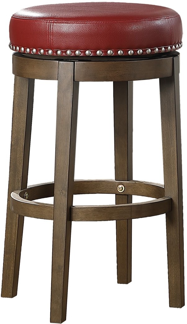 The round, swivel seat, pub height stool is presented at 29-inches. The brown finished wood legs complement the red bi-cast vinyl seat which features nailhead trim that further defines the stool’s round profile.Read More