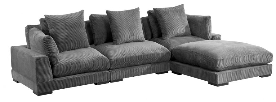 Tumble's corduroy naturally softens the sharp edges and hard lines of other accents like coffee and end tables with its inherent plushness. Framed in solid eucalyptus wood with extra, fully down-filled, removable back cushions, the Tumble Lounge is an ideal modular dream. This sectional’s soft corduroy will immediately add dimension, intrigue, lift, and comfort to any environment.