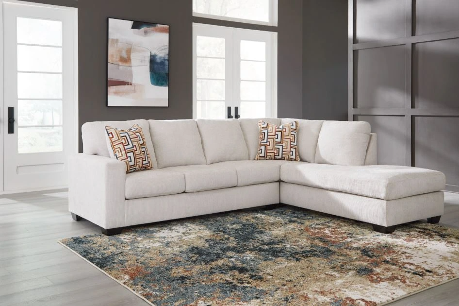 Liven up your living room with this sectional with chaise. Its trend-right light neutral upholstery is a perfect blank canvas for adding pops of color. Bold and eclectic accent pillows complete the look. Pairing posh style with everyday comfort, the sectional is a welcome addition to contemporary spaces.Read More