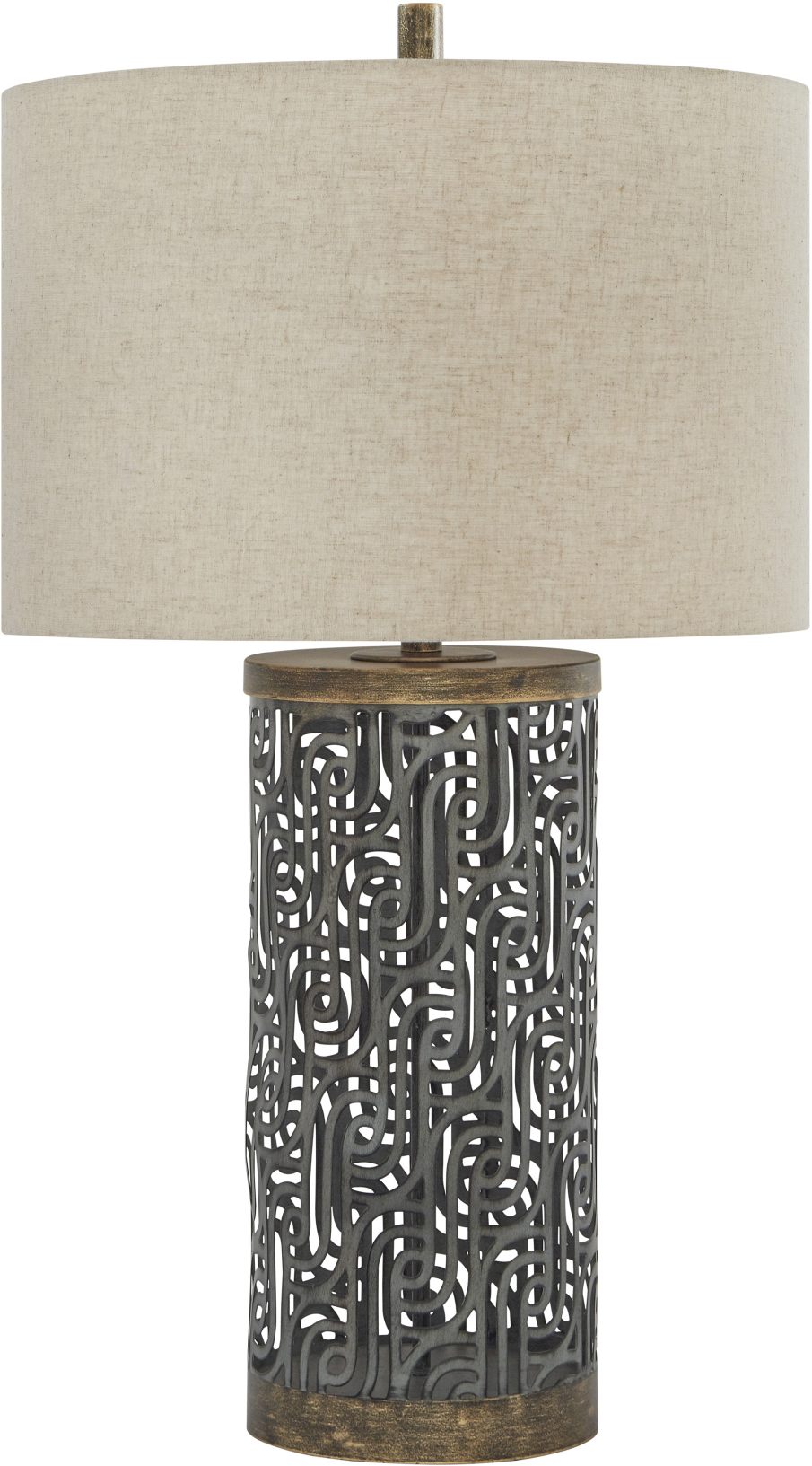 The cylindrical, antiqued-metal frame from the Dayo table lamp merges contemporary lines with the charm of vintage style. Turn the 3-way switch and watch your space come to life with the warm glow emitting from the fabric drum shade.