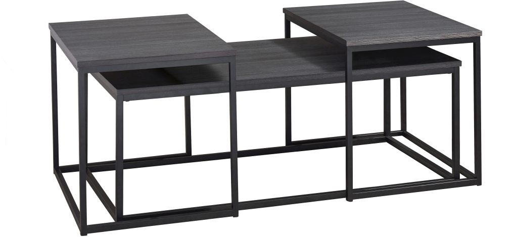 Casual contemporary design for modern living. Made with decorative laminate and engineered wood substrate with tubular metal bases. Replicated blackened wood finish with a grayed textural grain for a classic look. Bunching table design for small space living solutions. Bases feature a durable powdercoat finish.