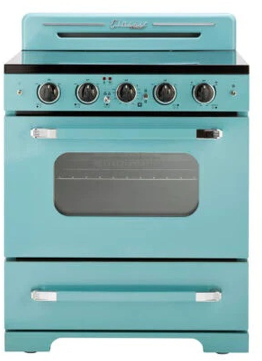 The 30" Classic Retro Electric Range transports you back to the ‘50s with its iconic retro design and chrome finished accents. It has a 5-element sleek glass electric cooktop capable of an intense sear or delicate sauce simmering. This range also allows for convection cooking circulating heat for incredibly even distribution.Read More
